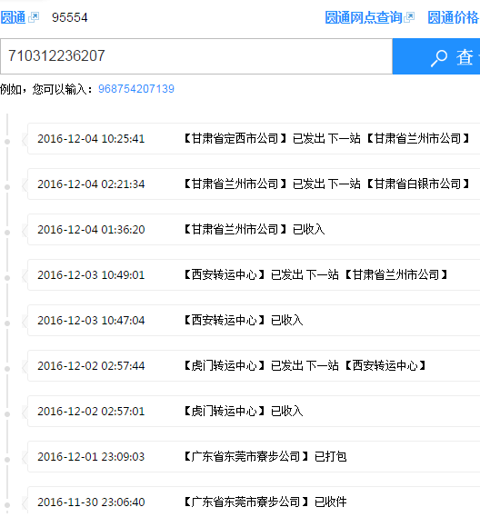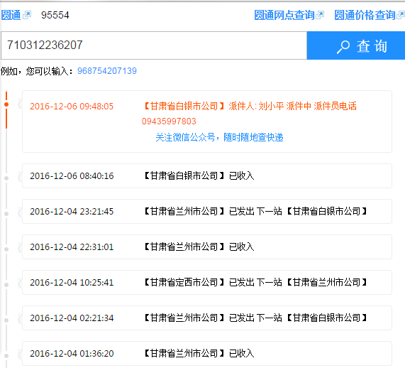 圓通快遞 運(yùn)單號(hào) 710312236207一般3到4天收到貨,現(xiàn)在7天沒(méi)收到。原因是圓通甘肅甘肅把我發(fā)白銀的貨發(fā)定西去了,從定西發(fā)回蘭州。再發(fā)白銀,蘭州離白銀70公里走了34個(gè)小時(shí)。大圓通95554電話聯(lián)系干脆拒接。我不明白這樣的公司怎么還能生存。行走路線截圖給大家看看。